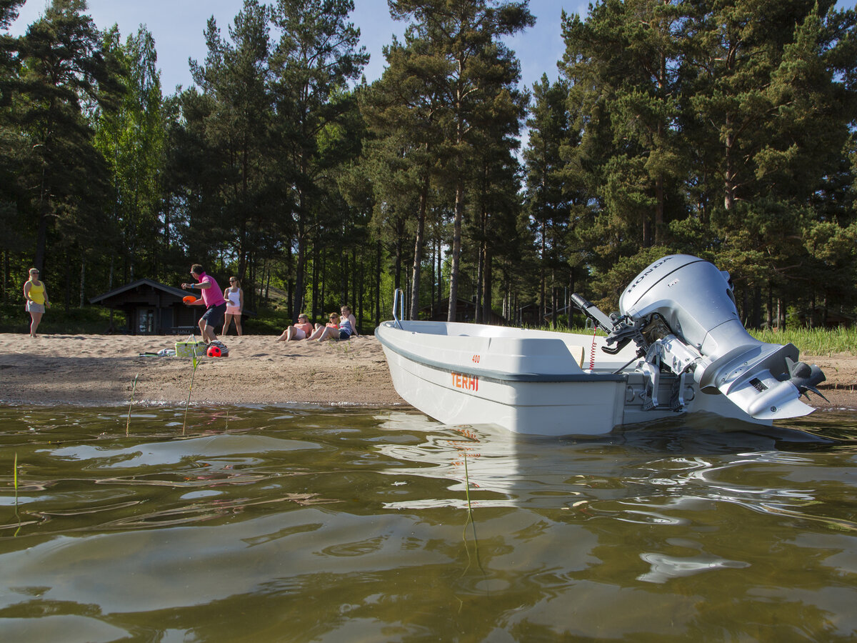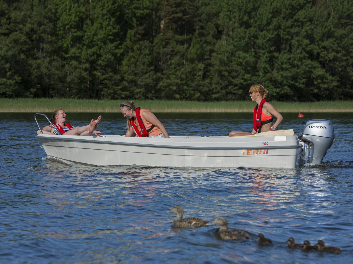 Terhi 400 er en fulltreffer av en hyttebåt velegnet for alle typer bruksområder og aldersgrupper. Den går meget lett i plan med en Tohatsu-påhengsmotor fra 5-15 hk. Båten er også svært velegnet å ro, både fra for- og midtsetet.