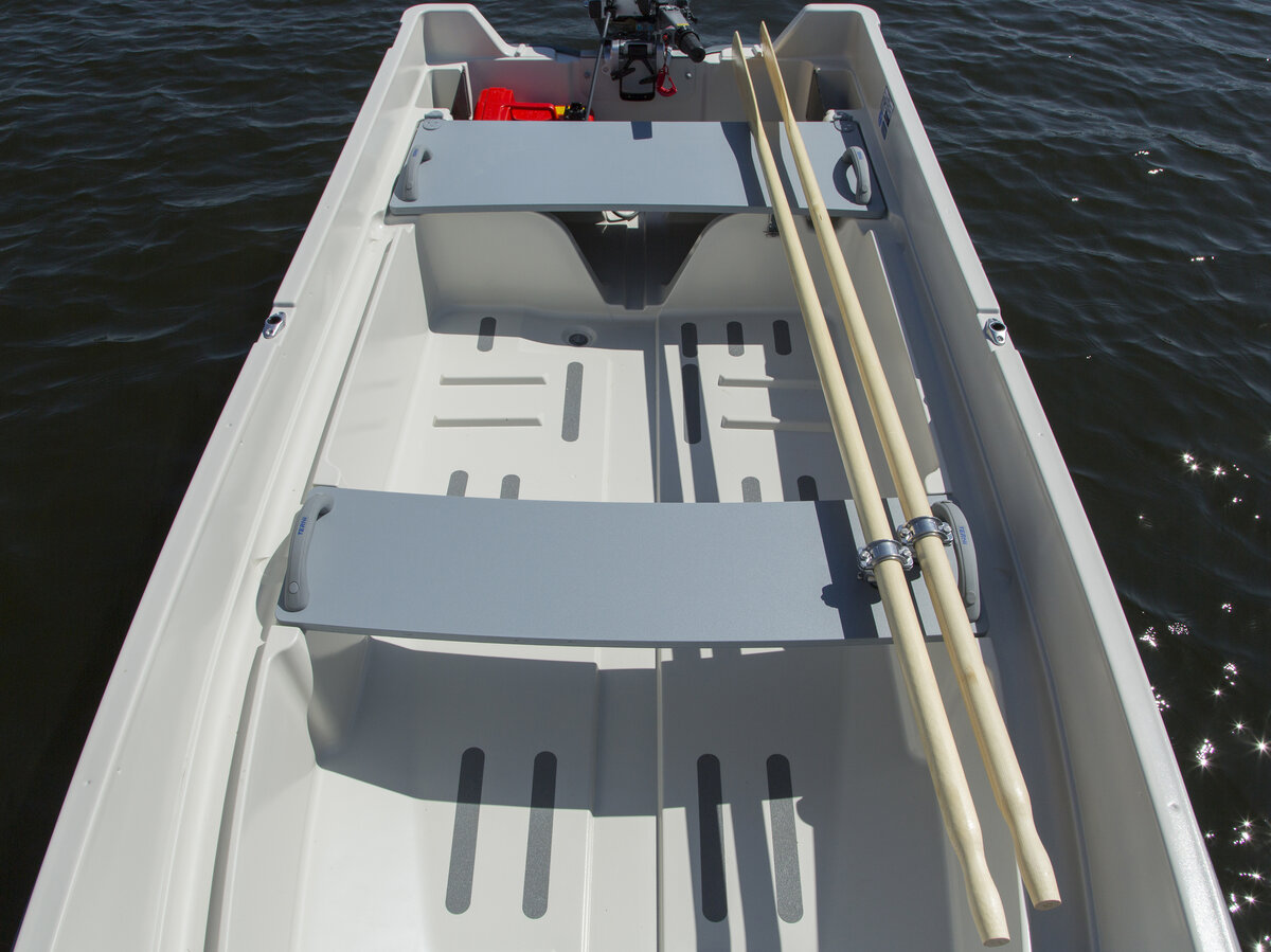 Båten er lett å trekke på land, enkel i bruk og full av smarte oppbevaringsløsninger som låsbare oppbevaringsrom for blant annet årer, drivstofftank og batteri, åpne kasser for tauverk i hjørnene akter. Modellen leveres i hvitt.