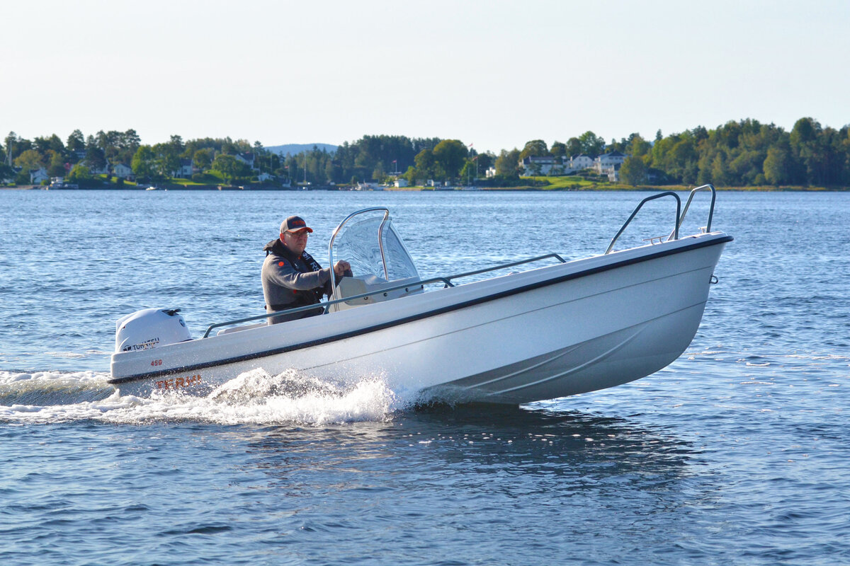 Konsollversjonen Terhi 450 C er en moderne, velutstyrt småbåt: Funksjonell, lettplanende og selvdrenerende. Båten er kun 450 centimeter men rommer likevel mye. Hver centimeter er godt utnyttet og styrekonsollen gir sikker kjøring.