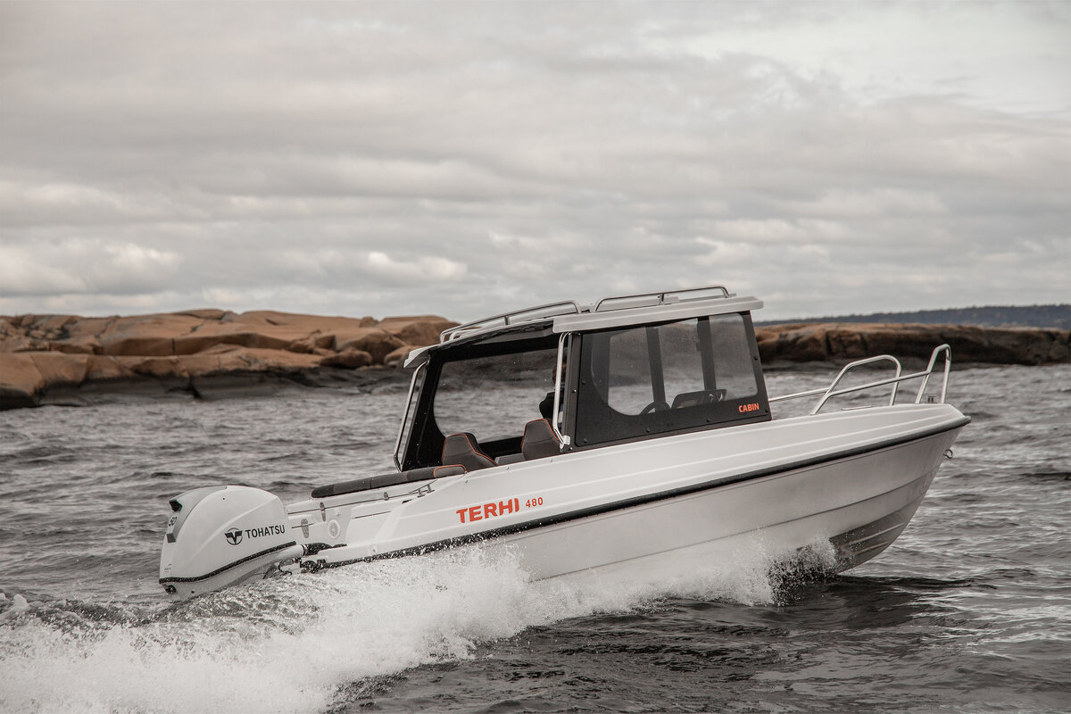 Lansert til 2024 kom denne modellen som skiller seg ut fra resten av båtene i Terhis portefølje på grunn av én bestemt funksjon – kabinen. Nyheten, som går under navnet Terhi 480 Cabin, er i hovedsak en hardtop-versjon av den populære Terhi 480 BR-modellen, som lar fører og passasjer reise beskyttet fra vind og sjøsprøyt i komforten av en kabin.